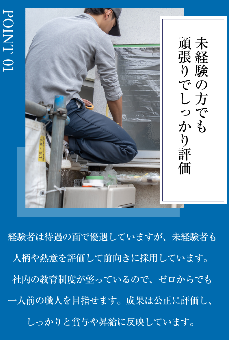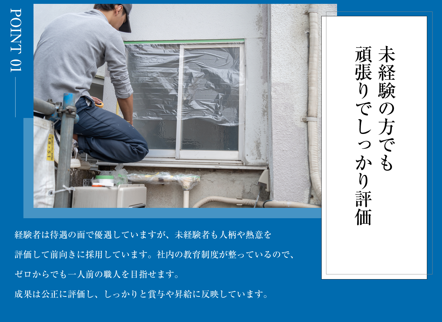 独立を目指す方、未経験の方、異業種から転職の方大歓迎!現場までの移動があるため、普通自動車免許が必要です。私たちと一緒に住宅を健全に守っていきましょう!