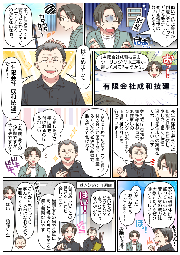 成和技建は愛知県内で防水工事、塗装工事、シーリング工事、外壁工事、サイディング工事、屋根工事などを行っている会社です。現場は主に住宅やマンションなどになります。